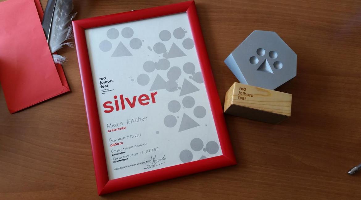 Одна из наших любимых работ "Ранние птицы", освещающая проблему ранних браков в Кыргызстане, созданная по заказу UNDP in the Kyrgyz Republic, получила серебрянную статуэтку в спецкатегории "Социальные ролики". Строгое жюри не присудило никому золота, так как посчитало, что достойных тому работ на фестивале не было. Поэтому фактически наш короткометражный фильм стал лучшим социальным роликом 2016 года по версии #RedJolborsFest2016!